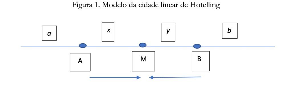 A menos que estejamos falando de setores com rigidez locacional, como é o caso das jazidas minerais, as empresas sempre terão incentivos em se instalar em pontos que ampliem a sua área protegida. Neste caso, a empresa que se localiza no ponto A tem incentivo em se deslocar o máximo possível para a direita e a empresa que se localiza no ponto B tem incentivo para se deslocar o máximo possível para a esquerda. Ao se comportar desta forma, as empresas se concentrarão no ponto M da figura 1, ficando a firma que tem o mercado cativo a à esquerda de M e a empresa que tem o mercado cativo b ficará à direita de M.