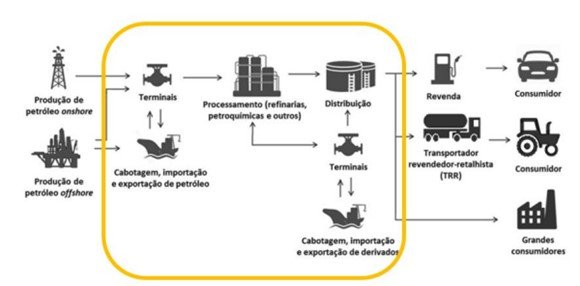 A cadeia produtiva do petróleo é formada por produção, refino, distribuição e revenda. As bacias de produção de petróleo estão à montante do elo de refino e as distribuidoras de combustíveis líquidos estão à jusante do elo mencionado. Importante mencionar que o petróleo marítimo produzido pelo Brasil se dá em 9 bacias, sendo as principais delas as bacias de Campos, de Santos, do Espírito Santo e do Recôncavo Baiano.