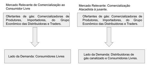 Por outro lado, apesar de acompanhar o Relator em suas conclusões quanto à aprovação da operação, o Conselheiro Victor Fernandes divergiu no tocante à delimitação dos mercados relevantes acima mencionados. No que se refere aos mercados de Comercialização de gás, o Conselheiro o definiu em “Comercialização Atacadista”, segmentado em dois níveis: a montante (i.e. entre produtores e importadores) e a jusante (que ocorre a partir da rede de transporte), aliás, também tratou do mercado de comercialização varejista, que consiste no fornecimento aos usuários do mercado cativo, atualmente de exclusividade das Concessionárias do serviço público de distribuição gás canalizado (Distribuidoras/CDL).