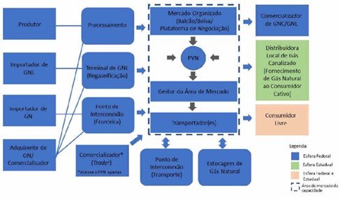 As recentes reformas do setor buscaram instituir o mercado de comercialização atacadista à jusante[11], a partir do Ponto Virtual de Negociação (“PVN”) ou “Hub” atrelado à respectiva área de capacidade de transporte- como o ambiente propício à competição entre os diferentes ofertantes (comercializadoras de produtoras, importadoras, do grupo econômico das distribuidoras e traders) para atender a demanda das CDL’s, dos consumidores livres e das distribuidoras a granel (GNL/GNC), de modo que as relações comerciais não sejam necessariamente atreladas ao fluxo físico da molécula, gerando, desse forma, liquidez, concorrência e flexibilidade, com aumento da oferta e entrada novos agentes. Por tais razões, o CNPE, através da Resolução n.03 de 2022, estabeleceu como de interesse da Política Energética Nacional que os agentes identifiquem nos contratos de comercialização o Ponto Virtual de Negociação como o ambiente de troca de titularidade do gás, conforme modelo estruturado nas reformas do setor: