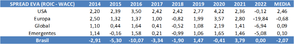 Tabela 2 – Spread de valor Agregado (ROIC – WACC): Brasil x Mercado Global