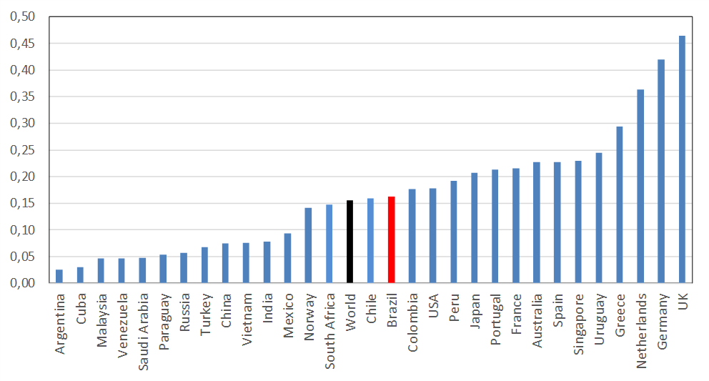 No entanto, a tarifa de energia elétrica, de cerca USD 0,163 kWh em 2023, não acompanha esse cenário virtuoso. Está acima da média mundial e de diversos países desenvolvidos e pares emergentes como ilustra a Figura 1. Um paradoxo.