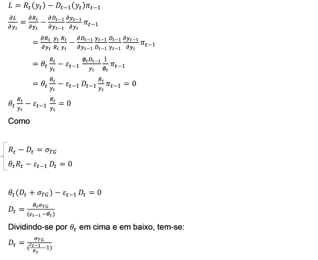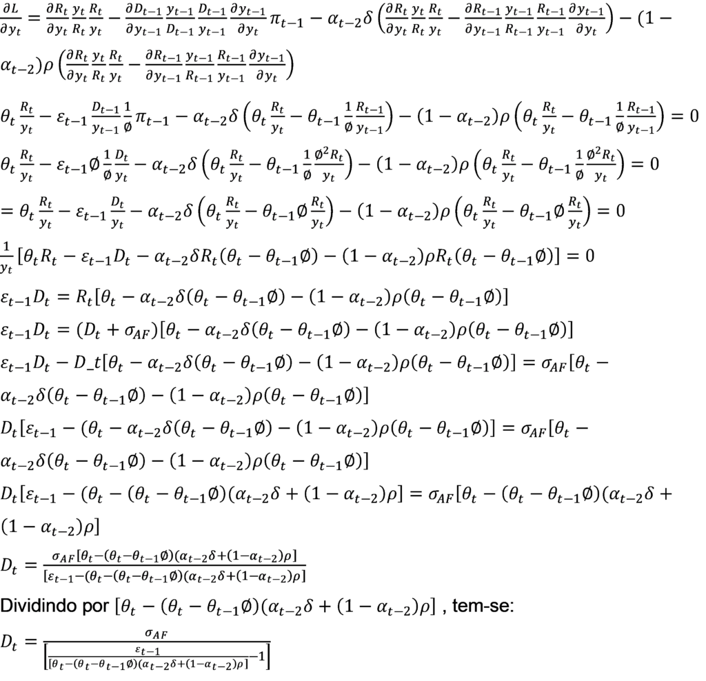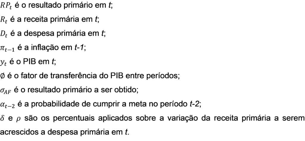 de onde se constata que a despesa primária em t depende do cumprimento ou não da meta de resultado primário αt, do percentual da variação da receita primária a ser incorporado na despesa no período t (δ,ρ), da elasticidade-PIB da despesa no período t-1 (εt-1) e da elasticidade-PIB da receita em t e t-1 (ϴt,ϴt-1) do efeito do PIB.