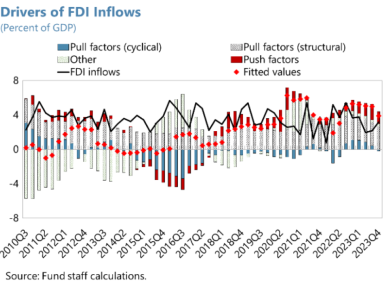 Como principal referência deste artigo, destaco o recente relatório anual do FMI da economia Brasileira (Brazil: 2024 Article IV Consultation) publicado mês passado, que dentre diversas sugestões de políticas e reformas estruturais, apresenta em seu Anexo 2, um modelo econométrico que estima os determinantes do fluxo de Investimento Externo Direto (IED) para os emergentes e para o Brasil.