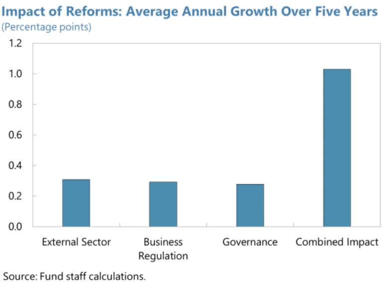 O relatório também relaciona a agenda regulatória positiva aos dividendos de crescimento e à sustentabilidade fiscal. Avançar nas reformas estruturais relacionadas à abertura comercial, regulação e governança tem potencial de aumentar o crescimento do país em cerca de 1% do PIB ao ano[2], conforme a ilustra a Figura abaixo.