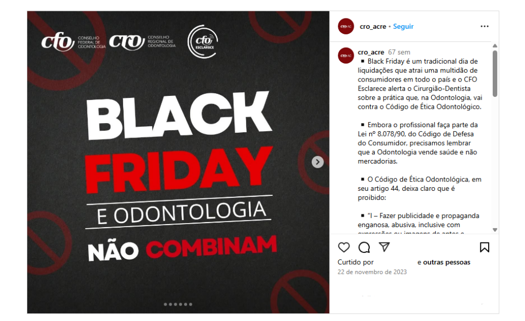 Apesar da decisão do Cade, o Denunciante alega que tanto o CFO quanto os CROs, continuaram a promover publicações que associam a oferta de descontos a práticas antiéticas. Durante a Black Friday de 2024, por exemplo, diversas postagens teriam sido feitas alertando os profissionais de odontologia sobre os riscos de oferecer descontos, sugerindo que isso violaria as normas éticas da profissão. Essas postagens foram feitas tanto no site do CFO quanto nas redes sociais dos CROs de vários estados, como Acre, Alagoas, Amazonas, Ceará, Distrito Federal, entre outros.