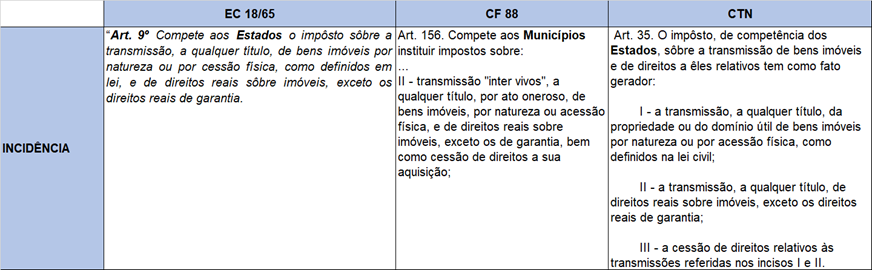 “Art. 9º Compete aos Estados o impôsto sôbre a transmissão, a qualquer título, de bens imóveis por natureza ou por cessão física, como definidos em lei, e de direitos reais sôbre imóveis, exceto os direitos reais de garantia. (gn)