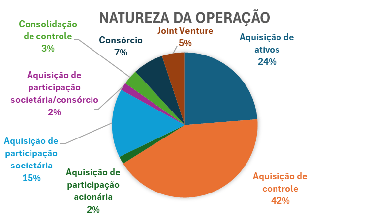No que se refere a natureza da operação, os resultados mostram que 42% das operações envolveram aquisição de controle e que 24% delas envolveu aquisição de ativos.
