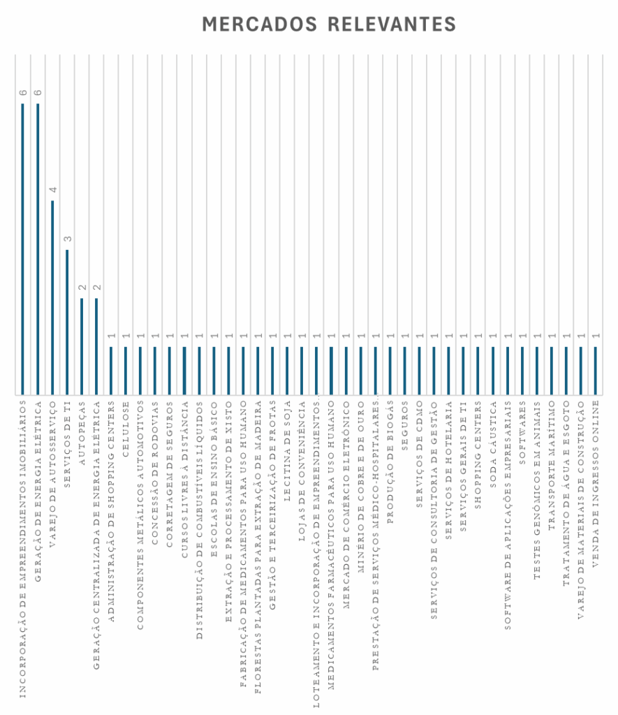 Em termos de mercado relevante, constatou-se que incorporação de empreendimentos imobiliários e geração de energia elétrica estiveram presentes em 6 (11%) atos de concentração aprovados cada um no mês de outubro e o mercado relevante de varejo de autosserviço esteve presente em 4 atos de concentração aprovados (7%).