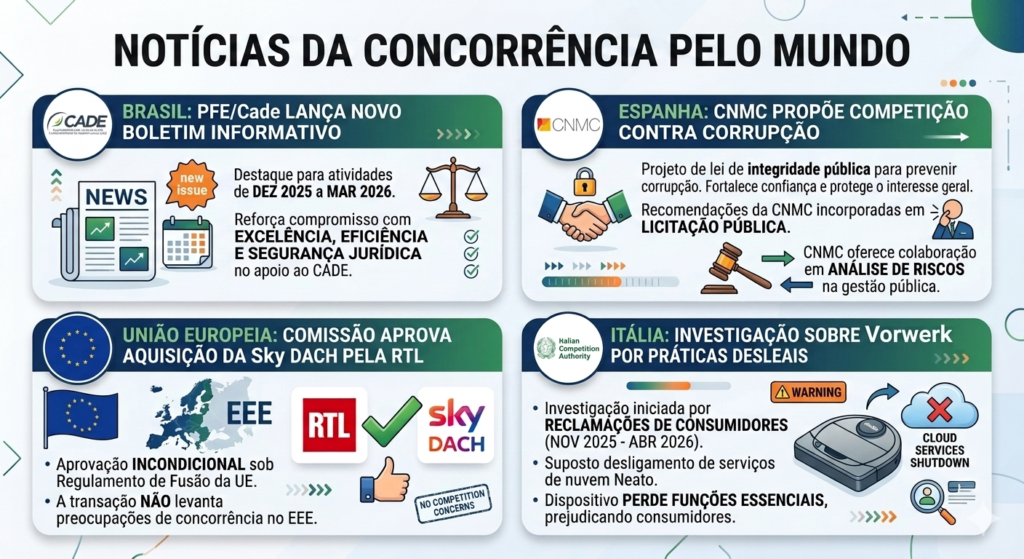No Brasil, a nova edição do boletim da Procuradoria Federal Especializada junto ao CADE – PFE/Cade reafirma o compromisso com a segurança jurídica e a eficiência institucional. Na esfera europeia, destacam-se a aprovação incondicional da aquisição da Sky DACH pela RTL, após a Comissão concluir pela ausência de riscos ao mercado, e a proposta da CNMC espanhola de utilizar a livre competição como pilar central no combate à corrupção e no fortalecimento da integridade em licitações públicas. Paralelamente, a autoridade italiana iniciou uma investigação contra a Vorwerk por práticas desleais, analisando o impacto do desligamento de serviços de nuvem na funcionalidade de dispositivos robóticos, o que reforça a vigilância contínua sobre a proteção dos direitos dos consumidores no setor tecnológico.