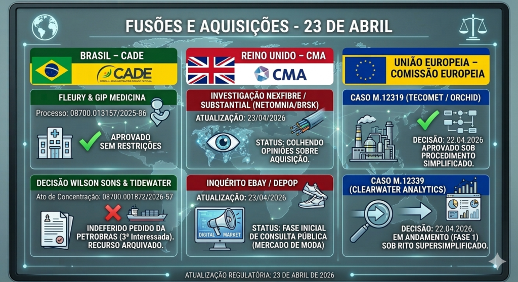 O CADE aprovou sem restrições a parceria entre Fleury e GIP Medicina, enquanto negou a intervenção da Petrobras no caso Wilson Sons e Tidewater, mantendo o arquivamento do recurso. No Reino Unido, a CMA iniciou consultas públicas para avaliar a aquisição da Substantial pela nexfibre (setor de fibra óptica) e a compra da Depop pelo eBay (mercado de moda). Simultaneamente, a Comissão Europeia finalizou a aprovação da joint venture envolvendo a Tecomet sob rito simplificado e avançou para a Fase 1 na análise do caso Clearwater Analytics, que segue em trâmite sob procedimento supersimplificado.